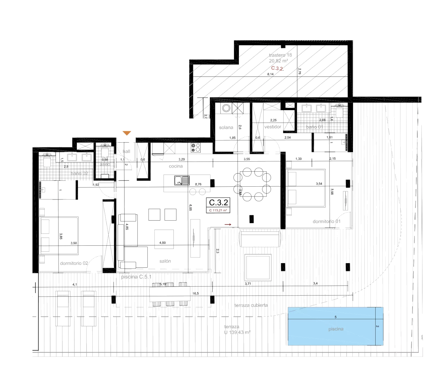 Exclusive modern apartment for sale in Los Gigantes, offering 2 bedrooms, 3 bathrooms, 113.21 m² of interior space, and 140.43 m² total area. Featuring a vast terrace with a private heated pool, panoramic sea views towards La Gomera, high-end furnishings, tourist rental license, and parking, this is a rare luxury property ideal for personal use or premium rental investment.